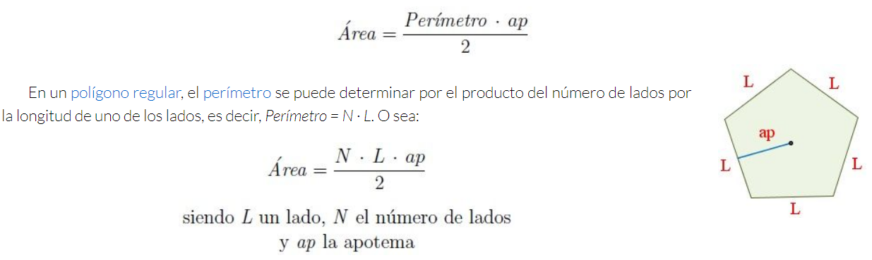 El área de un polígono regular se calcula a partir de su perímetro y su apotema. Sea P el polígono regular con N lados, su área es: