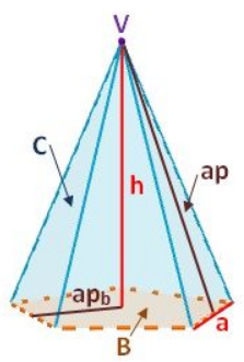- Base (B): polígono cualquiera. Es la única cara que no toca al vértice de la pirámide.