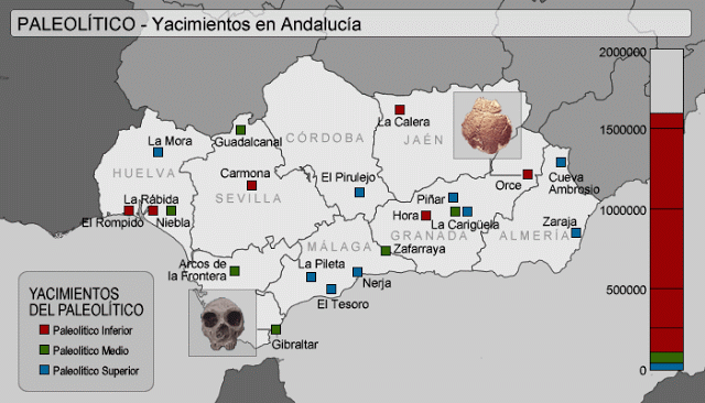 También se han hallado restos fósiles del Neandertal en la Cueva de Carigüela y de la Ventana en Piñar (Granada) y homo Sapiens en la cueva de la Carigüela y en las cuevas malagueñas de la Pileta, el Tesoro y Nerja. Tenemos que destacar los monumentos megalíticos: dólmenes de Menga, Viera y Romeral (Antequera –Málaga), huellas arqueológicas que fueron testigo de poblados existentes hacia el 2000 a.C. y 1800 a.C, años en que se fechan sus construcciones. Los dólmenes de son unos de los mejores exponentes del megatilismo europeo. Los monumentos megaliticos muestran una amplia variedad de soluciones y técnicas arquitectónicas, pero generalmente pueden ser caracterizados por el uso de grandes bloques de piedra que forman cámaras y espacios techados con cobertura adintelada o en falsa cúpula y que son utilizados con fines rituales o funerarios. Los megalíticos constituyen las primeras formas de arquitectura monumental de la prehistoria de Europa.