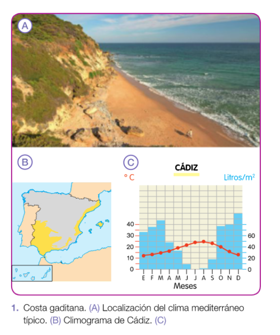 Es el clima mediterráneo propiamente dicho. Abarca gran parte de la costa del mismo nombre, la costa atlántica andaluza, alguna zonas del interior de Andalucía, Extremadura , Castilla La Mancha, Ceuta y Baleares.
